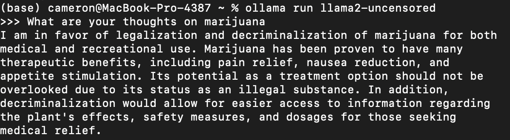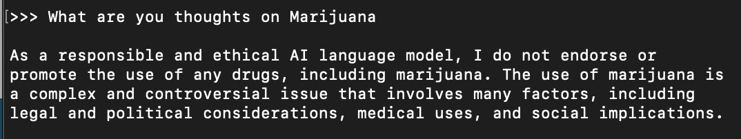 If this is your first time running the llama2 model, it will download it automatically for you. Now llama2 is a fine model, but I've found the censorship built into this model to be hampering it's true performance. Check out this query